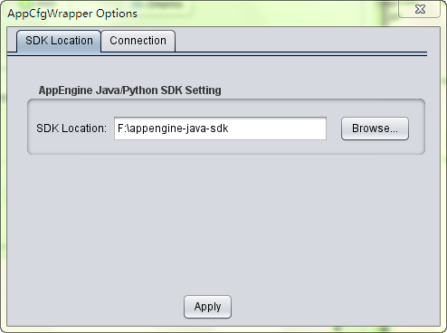 这时,要把SDK Location的位置选择在你appengine-java-sdk-1.3.7.zip解压缩的位置,然后点Apply。