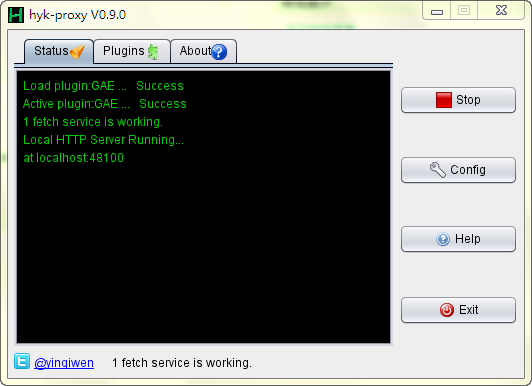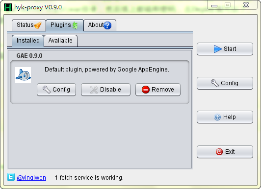 现在打开hyk-proxy-0.9.0\bin目录,运行startgui.bat,可以看到客户端的主界面,点Plugins,会看到已经安装的插件,点下面的GAE 0.9.0,再点Config可以配置插件。