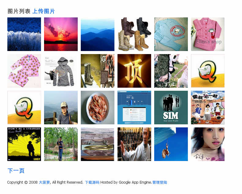 这个程序严格说来是没有后台管理的,只有一个google账号的登录地址,还有上传地址,简单的不能再简单了,一开始heartnn还没有找到删除照片的地方,傻的跑到GAE的后台数据库里去了,最后发现打开一个图片的时候,在旁边的简介里有删除的链接,真是囧啊。。。