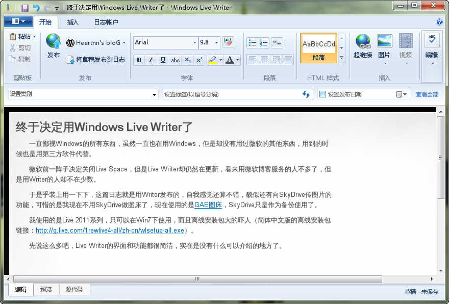 于是乎装上用一下下,这篇日志就是用Writer发布的,自我感觉还算不错,貌似还有向SkyDrive传图片的功能,可惜的是我现在不用SkyDrive做图床了,现在使用的是GAE图床,SkyDrive只是作为备份使用了。
