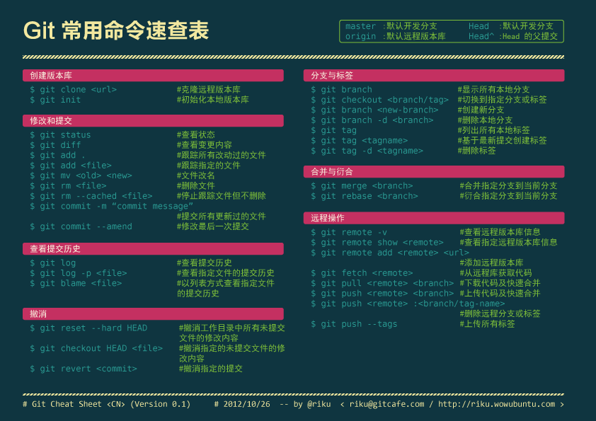 使用git托管的好处就是,只要在电脑里装上node.js和git,然后将博客代码clone回来,就可以在本地写博客了,当然前提是把整个博客代码(不是生成的文件)push到git仓库里;缺点是你需要熟悉一些git命令,在这里借用一个表格: