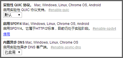 这里我没有开启实验性QUIC协议,据某些网友说可能会降低浏览速度。但是内置异步DNS的效果很好,因为本地解析到*.l.google.com或类似域名的时候,可能会忽略hosts文件中的IP,从而解析到被屏蔽的IP地址。(今天自己发现访问谷歌Chrome商店时无法打开,经过开启内置异步DNS后没问题了。)