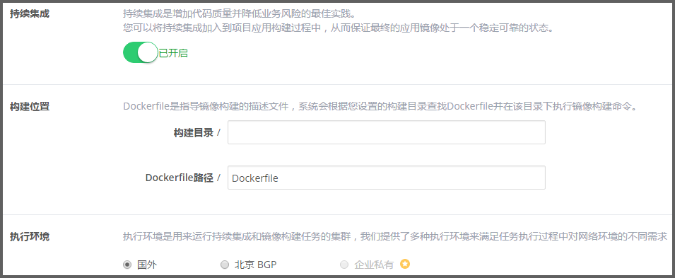可能会提示Dockerfile不存在,但是没有关系,执行环境Github的话就选国外,如果是Coding什么的就选北京(并将daocloud.yml中npm使用淘宝源)。