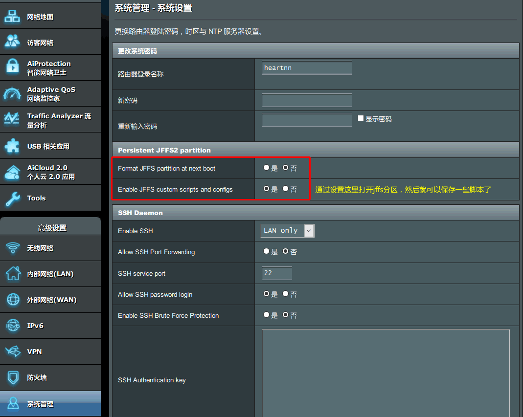 然后打开jffs分区,以便保存运行的脚本设置,使用软件中心的话也必须打开jffs分区: