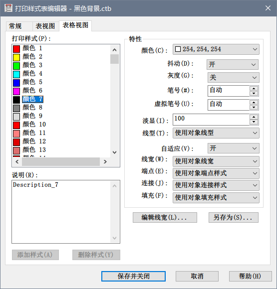 打印的土建图纸部分,文字本身是白色的,但实际打印的时候会被打印为黑色,所以这里对黑色进行编辑(也就是颜色7),颜色下拉到选择颜色,白色本来应该是255,255,255的,但似乎系统不允许,所以在这里改成254,254,254,相差一点根本看不出来。