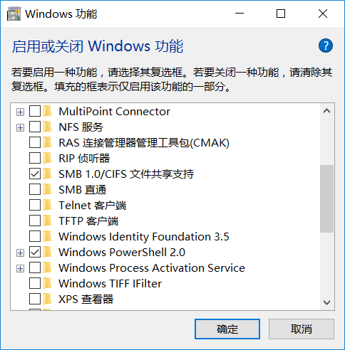 结论是只能启用SMB 1.0了,首先打开控制面板–>程序和功能–>启用或关闭Windows功能,勾选SMB 1.0/CIFS文件共享支持。